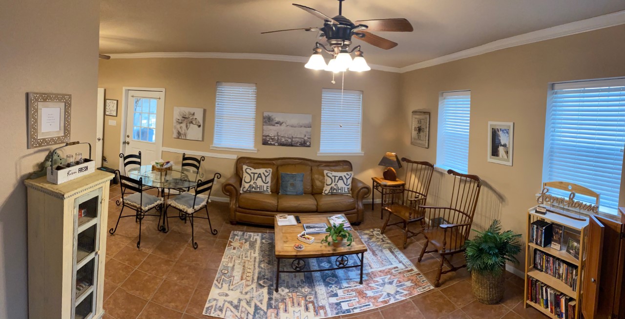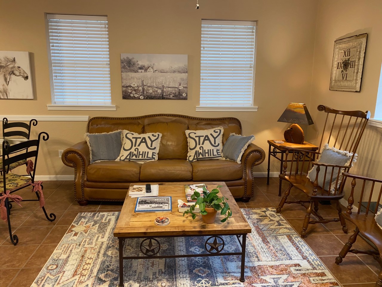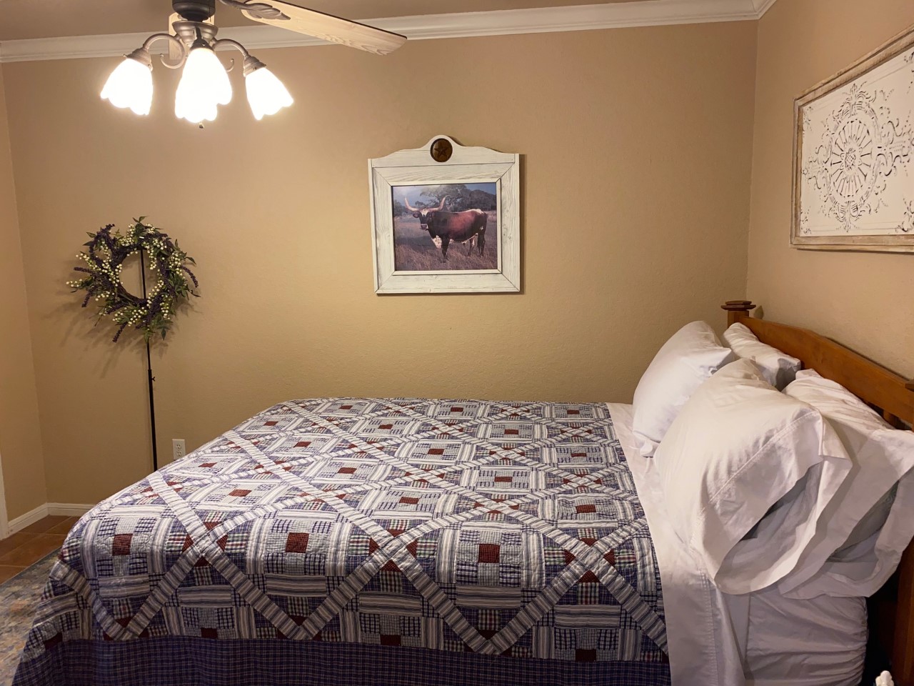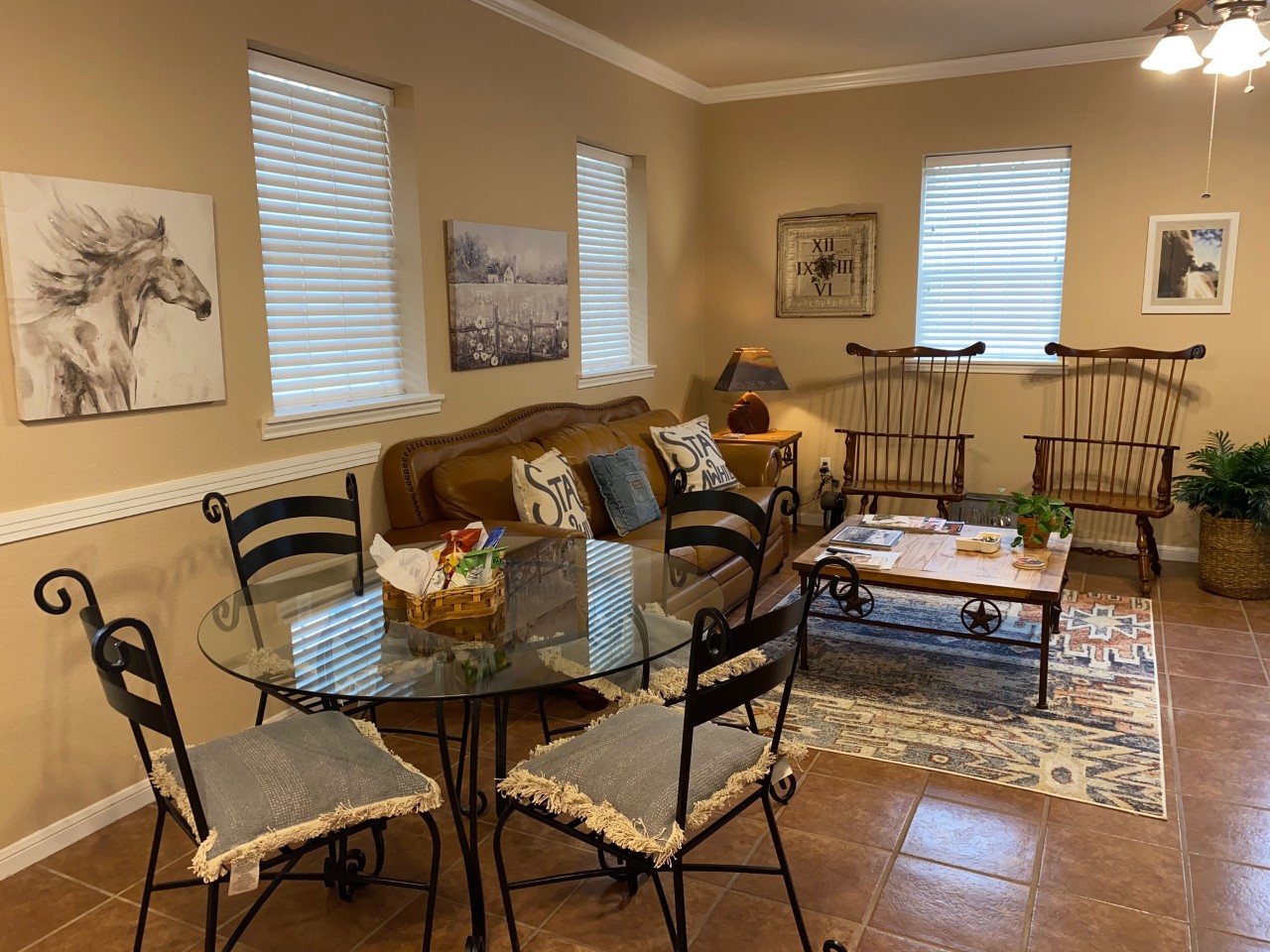 The cottage has a living/dining/kitchen combination and is beautifully decorated with a separate bedroom with a queen size bed. The cottage has a newly renovated kitchen with stainless appliances. It also has granite countertops and a new porcelain tile shower. The cottage has a flat screen television with Netflix, Hulu, and Disney available. There is a DVD player with a wide variety of DVD's. There is WIFI and a day bed. Our property is located across the street from a large ranch. The Texas Star Cottage is accessed by a private gate. The cottage beats any hotel room in terms of privacy, space, covered parking, and hospitality.
